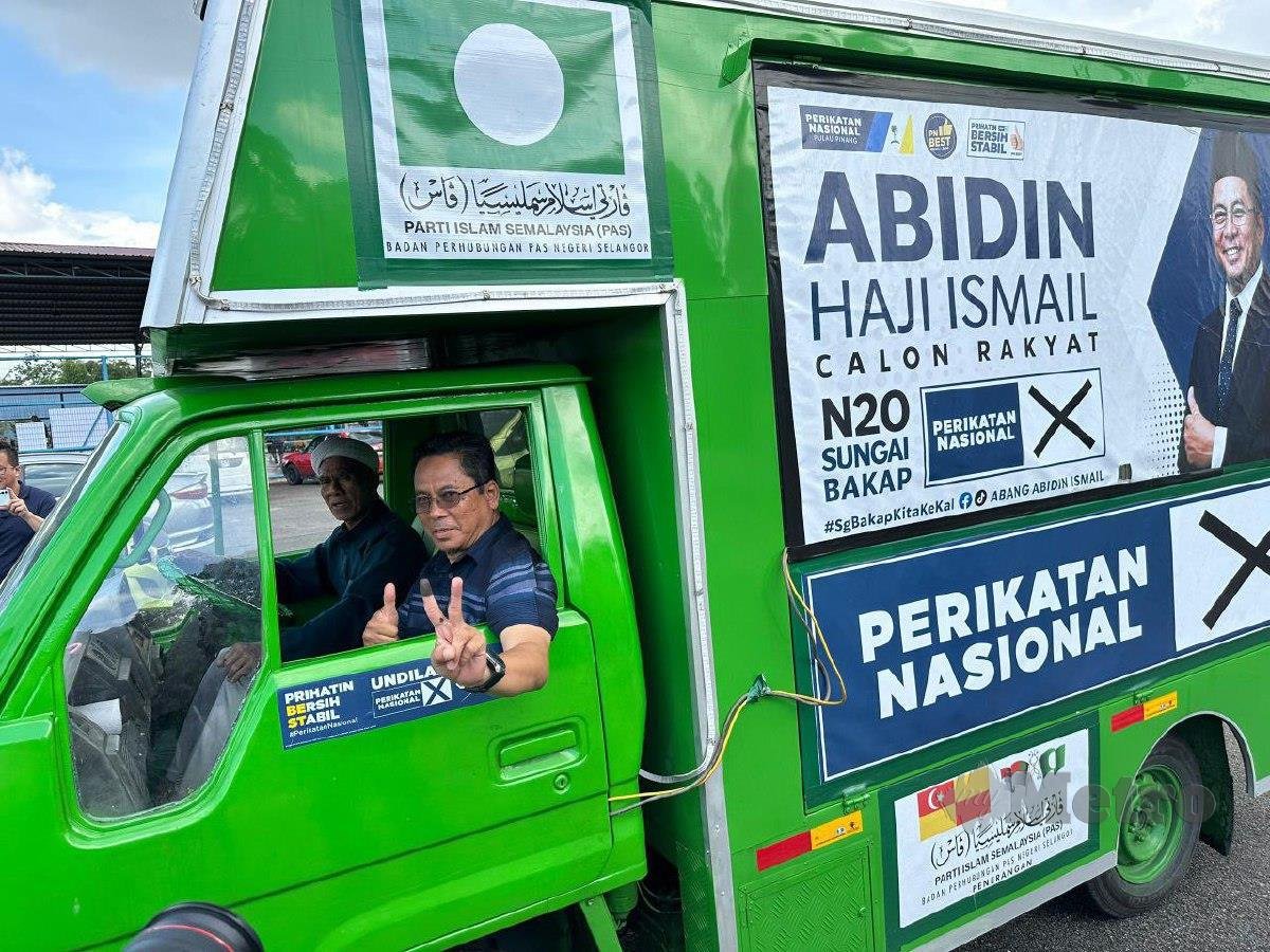 NIBONG TEBALl: Calon Perikatan Nasional (PN) Abidin Ismail tampil dengan cara unik ‘meronda’ menggunakan lori untuk menyampaikan ucapan terima kasih kepada pengundinya selepas memenangi Pilihan Raya Kecil (PRK) Dewan Undangan Negeri (DUN) Sungai Bakap semalam.
