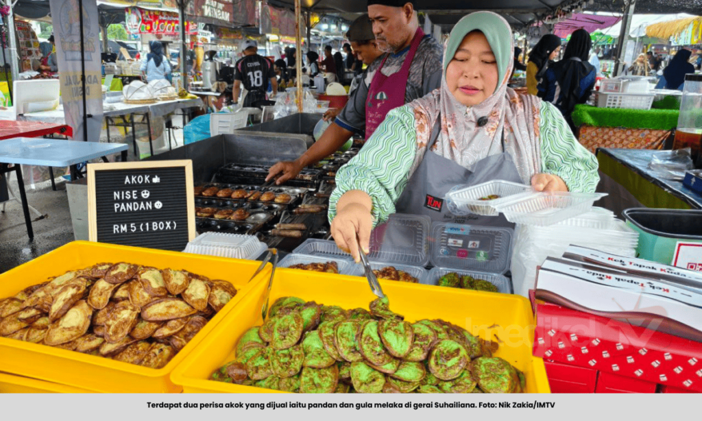 Menurut Suhailiana terdapat dua perisa akok yang dijual iaitu pandan dan gula melaka atau lebih dikenali ‘nisan’.