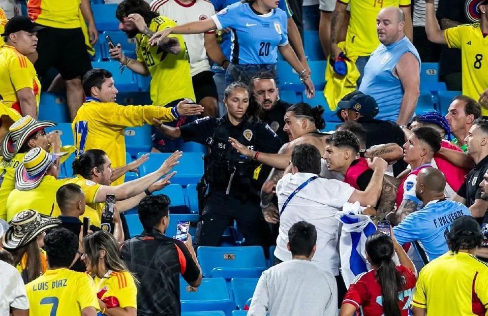 Selepas Colombia menang 1-0 di Charlotte, Carolina Utara, pemain-pemain Uruguay memanjat ke tempat duduk penonton dan bertumbuk dengan penyokong pasukan lawan.