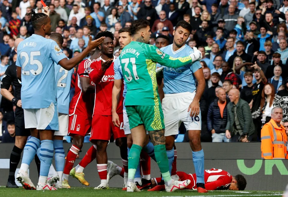 Pemain Manchester City, Rodri (dua dari kanan) dibuang padang selepas menerima kad merah daripada pengadil Anthony Taylor pada aksi menentang Nottingham Forest di Stadium Etihad, Manchester lewat malam tadi. – Foto REUTERS
