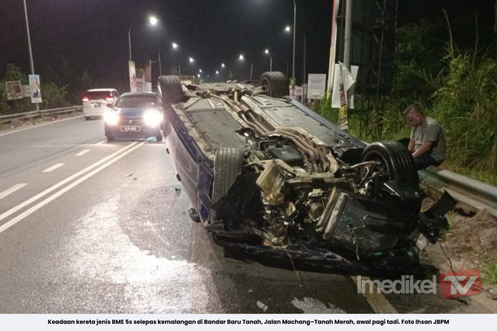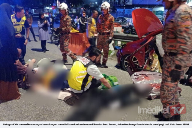 TANAH MERAH: Dua maut manakala lima lagi terselamat dalam satu kemalangan membabitkan dua kenderaan di Bandar Baru Tanah, Jalan Machang–Tanah Merah, awal pagi tadi.