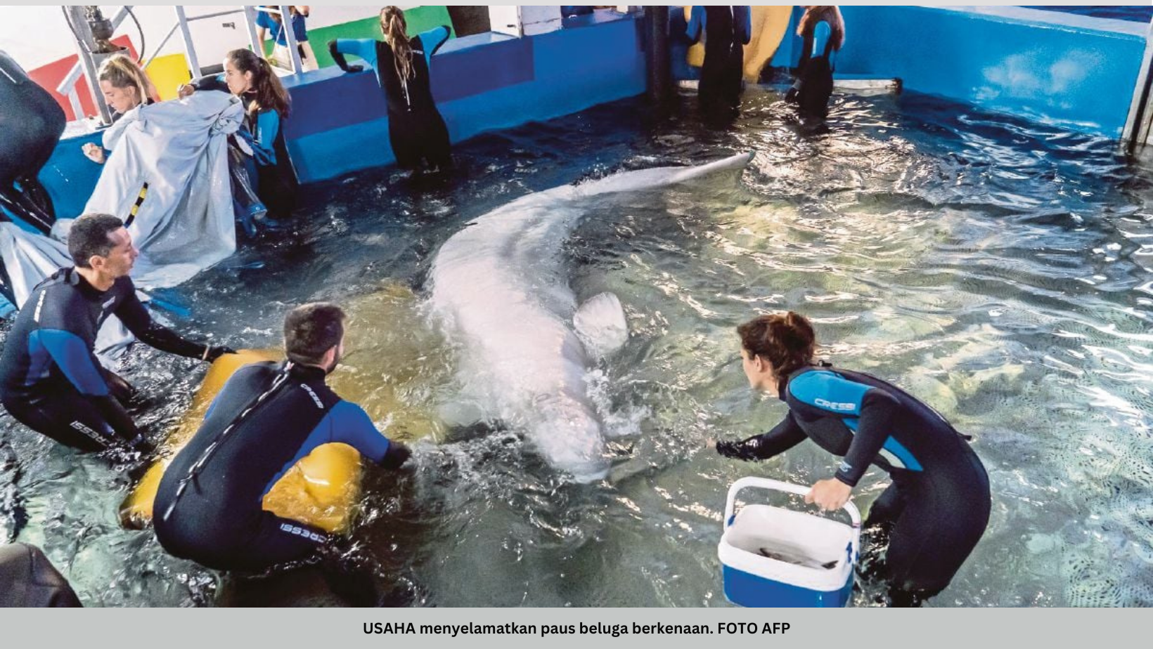 Sejak Rusia menyerang Ukraine pada 2022, Nemo Dolphinarium di Kharkiv berjaya memindahkan beberapa anjing laut, singa laut dan ikan lumba-lumba, namun pemindahan beluga memerlukan persiapan berbulan-bulan kerana keadaan saiznya. – AFP, HMetro –