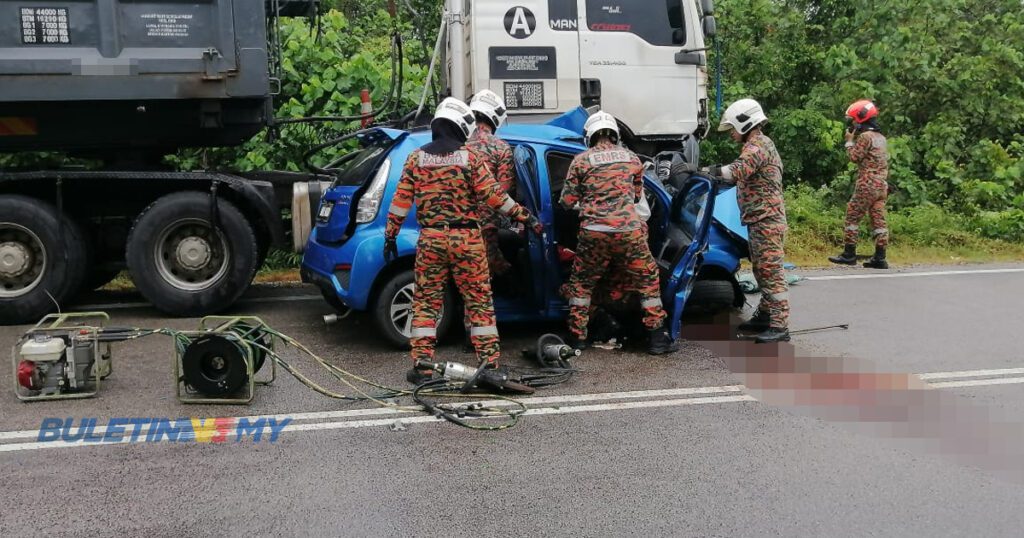 “Sebaik tiba di lokasi mendapati sebuah lori bertembung dengan Perodua Myvi dan dua mangsa tersepit dalam kereta remuk terbabit,”
