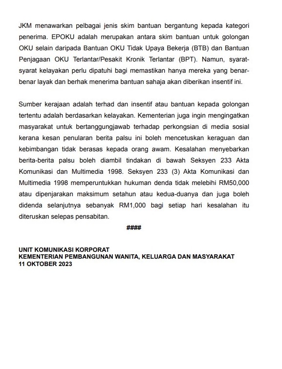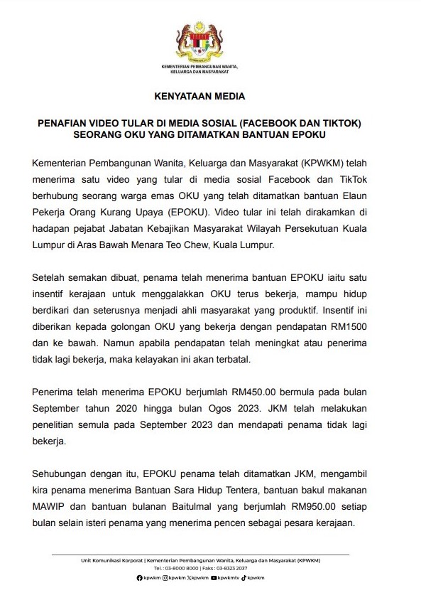 Baru-baru ini, KPWKM menerima satu video yang tular di media sosial Facebook dan TikTok berhubung seorang warga emas OKU yang telah ditamatkan bantuan Elaun Pekerja Orang Kurang Upaya (EPOKU).