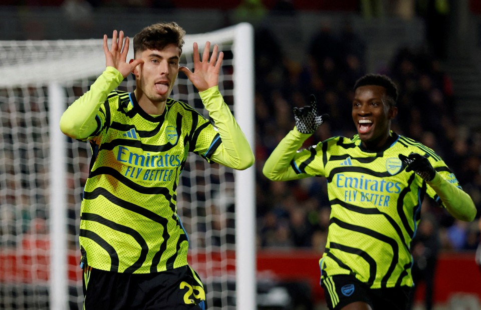 Soccer Football - Premier League - Brentford v Arsenal - Brentford Community Stadium, London, Britain - November 25, 2023 Arsenal's Kai Havertz celebrates scoring their first goal with teammate Eddie Nketiah Action Images via Reuters/Andrew Couldridge NO USE WITH UNAUTHORIZED AUDIO, VIDEO, DATA, FIXTURE LISTS, CLUB/LEAGUE LOGOS OR 'LIVE' SERVICES. ONLINE IN-MATCH USE LIMITED TO 45 IMAGES, NO VIDEO EMULATION. NO USE IN BETTING, GAMES OR SINGLE CLUB/LEAGUE/PLAYER PUBLICATIONS. TPX IMAGES OF THE DAY