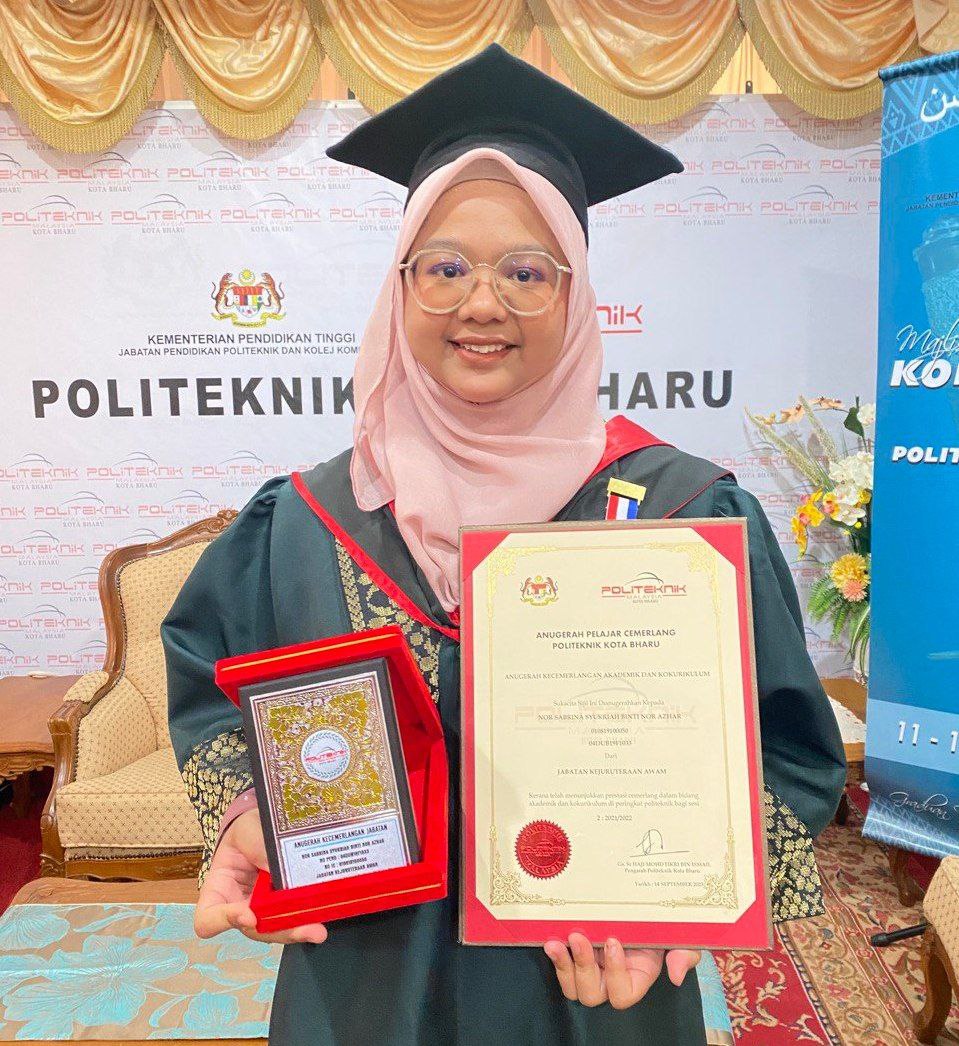 Sabrina yang juga anak kedua daripada empat beradik itu pernah menerima anugerah ketua jabatan sepanjang semester dan aktif melibatkan diri dalam aktiviti jabatan mahupun politeknik.