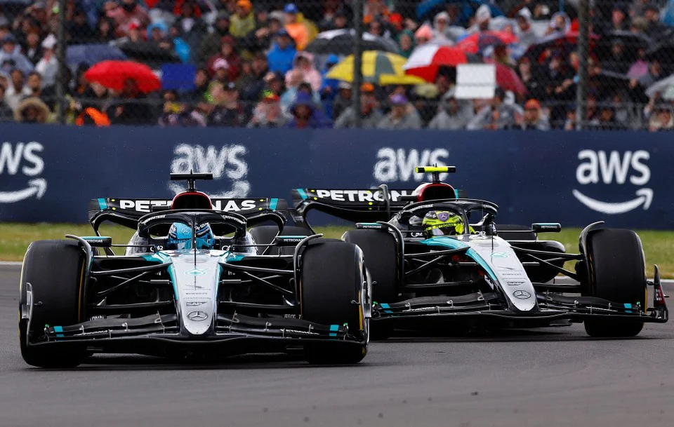 Pemandu Mercedes, Lewis Hamilton (kanan) memintas rakan sepasukannya George Russell pada perlumbaan GP F1 Britain di Litar Silverstone awal pagi tadi. – Foto AFP