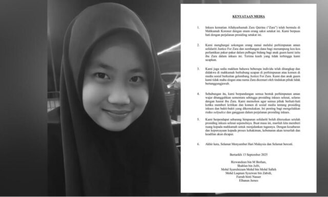 “Kami menghargai sokongan orang ramai melalui perhimpunan aman solidariti Justice For Zara dan sumbangan dana bagi menampung kos-kos perlantikan pakar-pakar dalam pelbagai bidang bagi anak guam kami iaitu ibu Zara dalam inkues ini. Terima kasih yang tidak terhingga kami ucapkan.