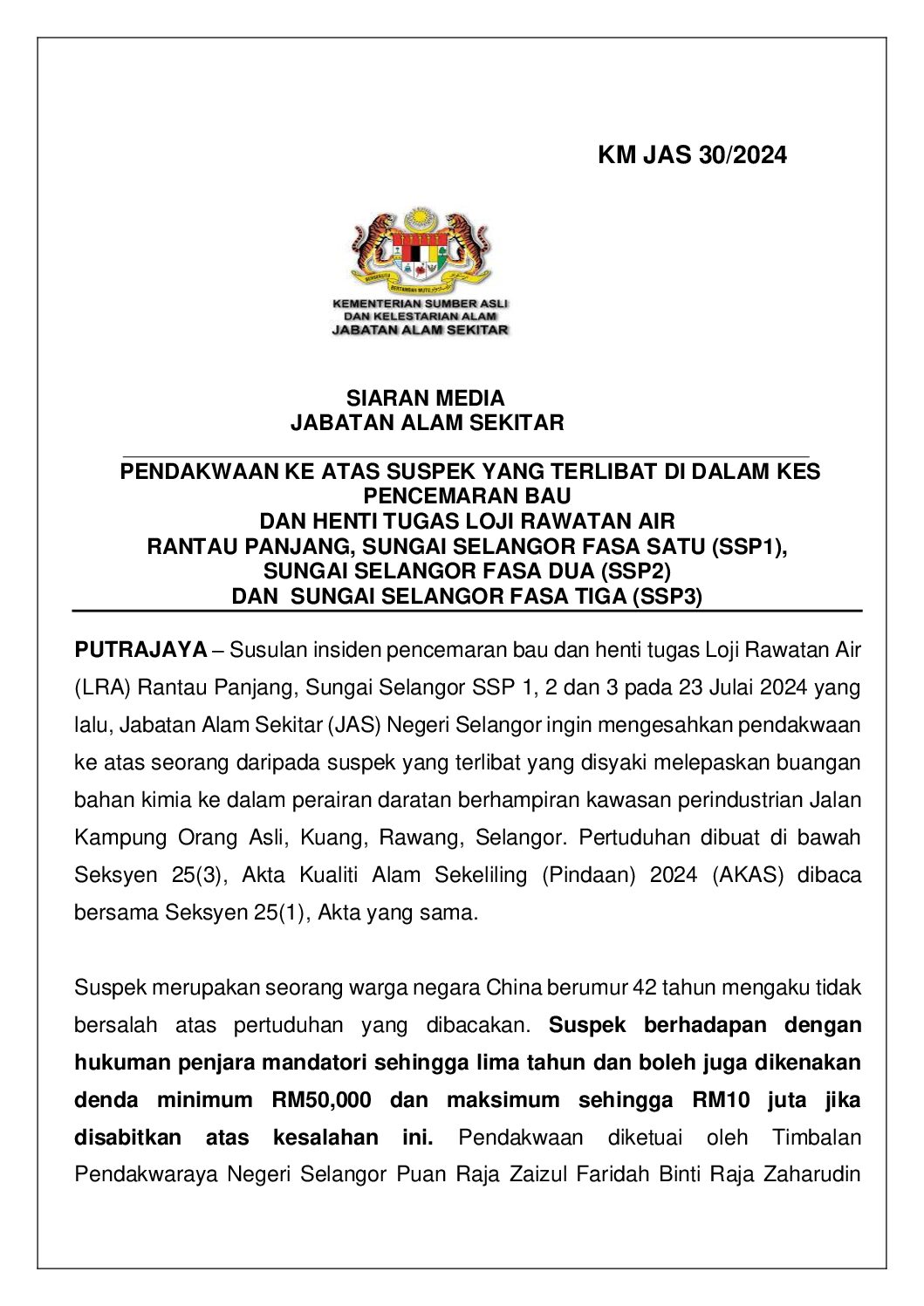 “Susulan insiden pencemaran bau dan henti tugas Loji Rawatan Air (LRA) Rantau Panjang, Sungai Selangor SSP 1, 2 dan 3 pada 23 Julai 2024 yang lalu.