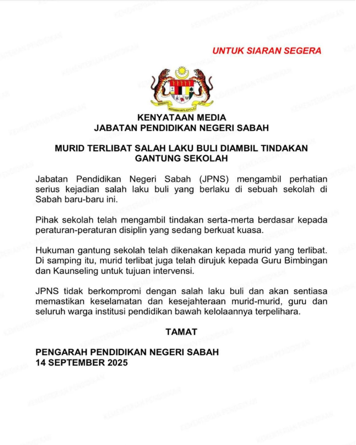 “Selain hukuman gantung sekolah, murid terbabit turut dirujuk kepada Guru Bimbingan dan Kaunseling untuk tujuan intervensi,” menurut kenyataan itu.
