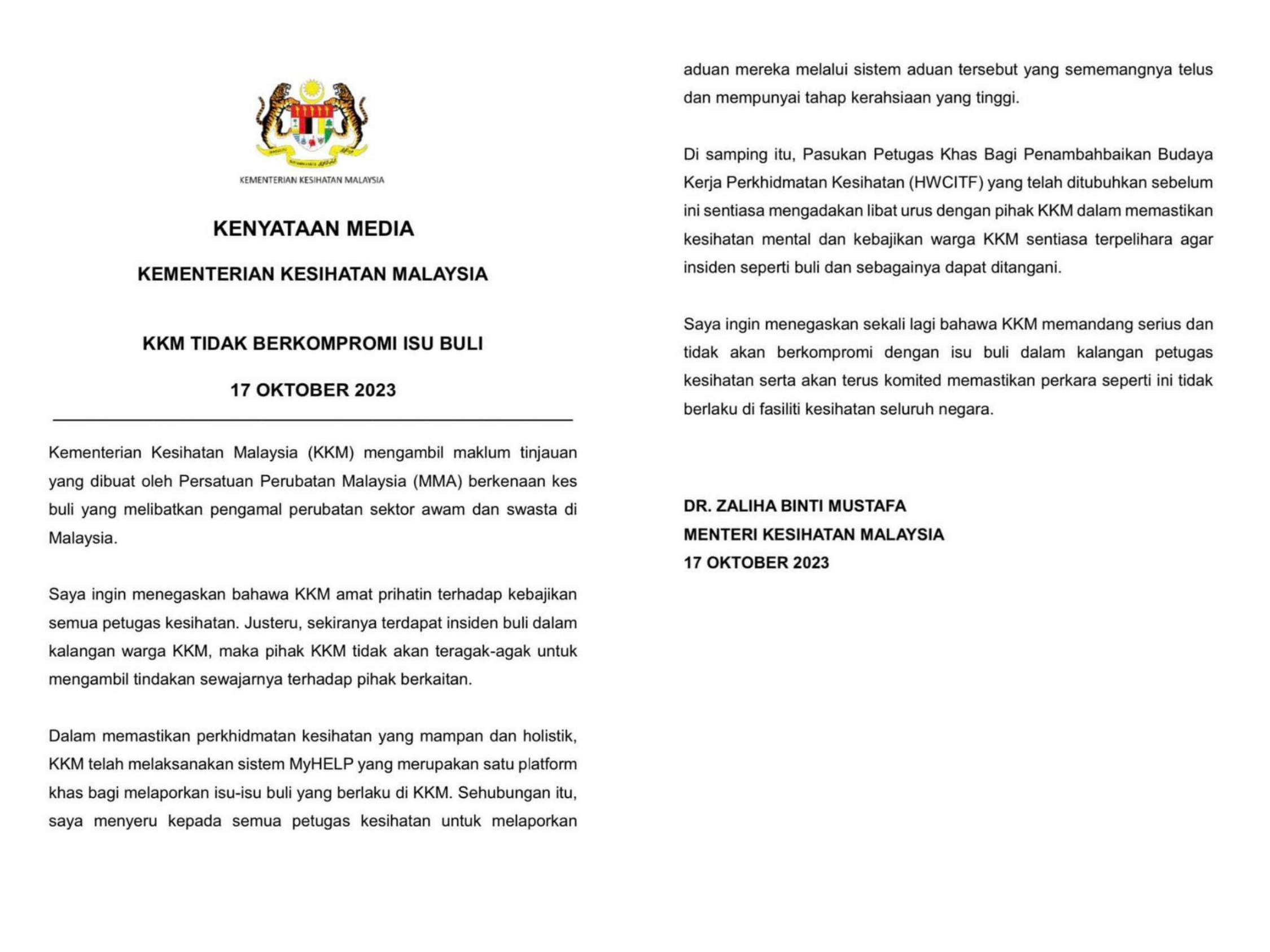 “Saya ingin menegaskan sekali lagi bahawa KKM memandang serius dan tidak akan berkompromi dengan isu buli dalam kalangan petugas kesihatan serta akan terus klomited memastikan perkara seperti ini tidak berlaku di fasiliti kesihatan seluruh negara,” katanya.