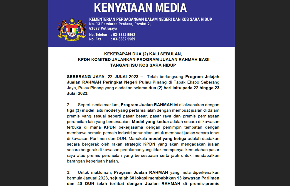 Penganjuran program ini dapat dilihat memberi kesan yang positif dalam usaha untuk meringankan kos sara hidup warga Malaysia MADANI. – Kenyataan Media KPDN –