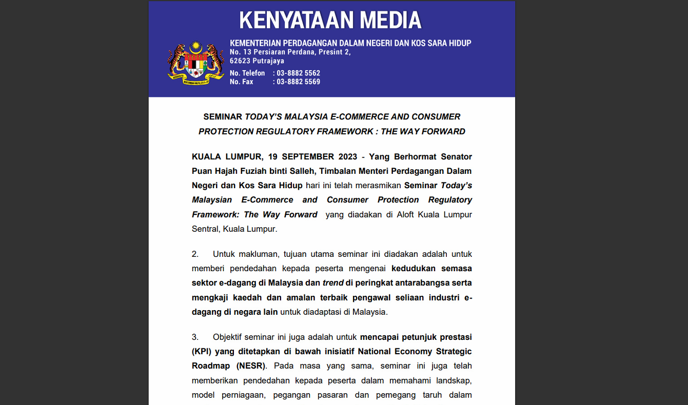 “KPDN berharap dan memohon agar semua penyedia perkhidmatan dan pemain industri edagang turut sama memikul tanggungjawab untuk memastikan hak pengguna dan keselamatan data peribadi pengguna terjamin. Kementerian yakin, jika semua pihak memainkan peranan yang proaktif, industri e-dagang di Malaysia akan berkembang dengan pesat dan seimbang dengan kebajikan pengguna,”katanya.