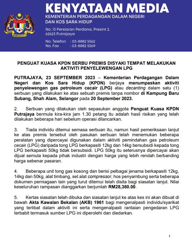 PUTRAJAYA: Kementerian Perdagangan dalam Negeri dan Kos Sara Hidup (KPDN) menumpaskan aktiviti penyelewengan gas petroleum cecair (LPG) dalam satu serbuan dengan nilai keseluruhan rampasan dianggarkan berjumlah RM28,380.00.