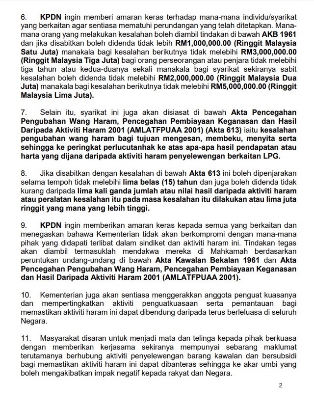 Kertas siasatan telah dibuka dan siasatan lanjut ke atas kes ini akan dibuat di bawah Akta Kawalan Bekalan (AKB) 1961 bagi mengenalpasti individu/syarikat yang terlibat dalam aktiviti ini serta mengenalpasti rantaian pengedaran lpg terbabit termasuk sumber lpg ini diperolehi dan diedarkan. – KPDN –