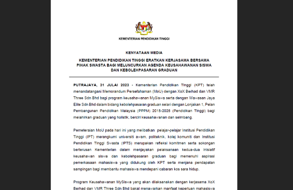 PUTRAJAYA: Kementerian Pendidikan Tinggi (KPT) telah menandatangani Memorandum Persefahaman (MoU) dengan XoX Berhad dan VMR Three Sdn Bhd bagi program keusahawanan MySiswa serta dengan Wawasan Jaya Elite Sdn Bhd dalam bidang kebolehpasaran graduan selari dengan Lonjakan 1, Pelan Pembangunan Pendidikan Malaysia (PPPM) 2015-2025 (Pendidikan Tinggi) bagi melahirkan graduan yang holistik, berciri keusahawanan dan seimbang.