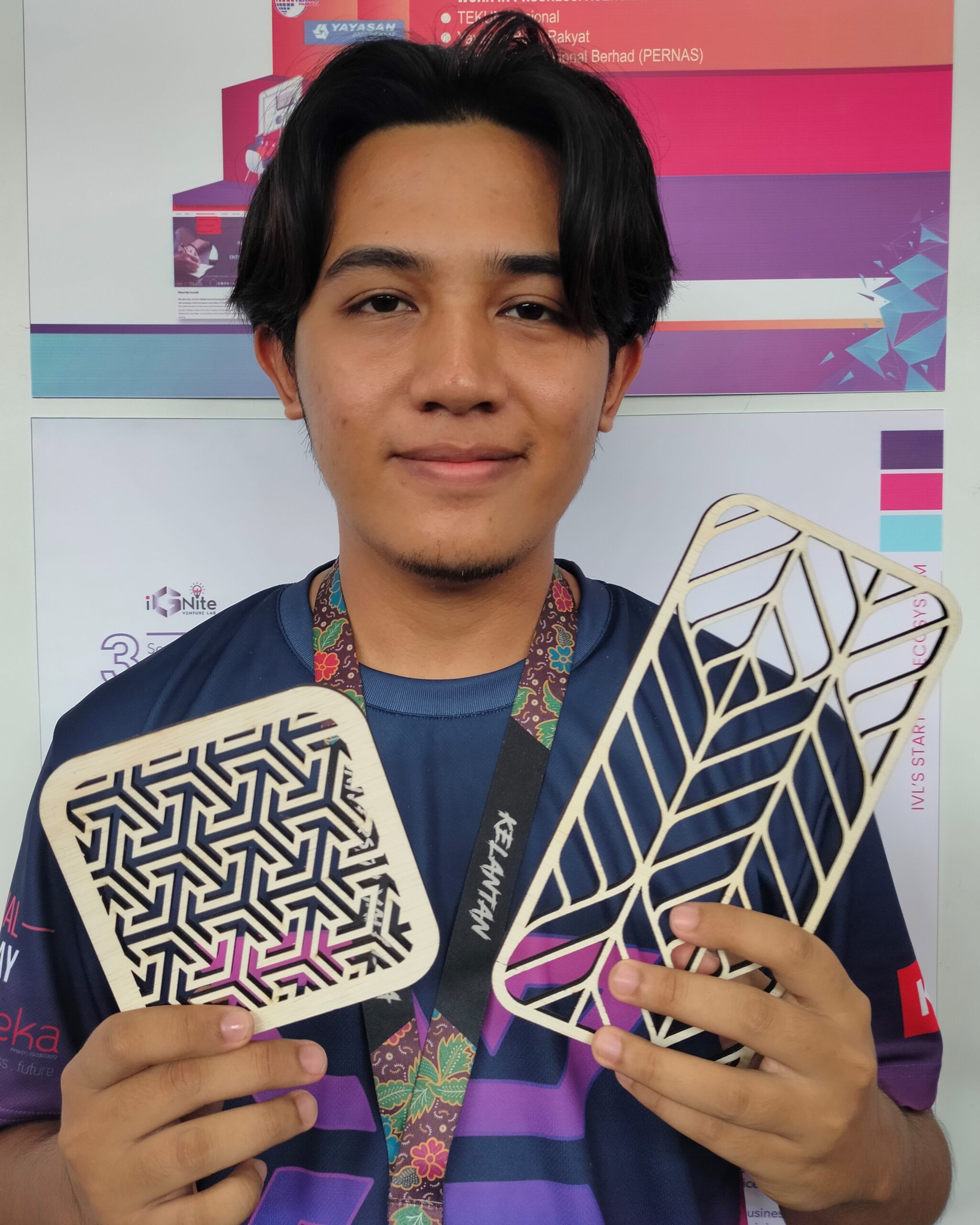 BACHOK: Seramai enam pelajar tahun dua dari jurusan Teknologi Kreatif Elektif Reka Bentuk Industri di Universiti Malaysia Kelantan (UMK) mempamerkan kemahiran dan kreativiti menghasilkan pelapik gelas (coaster) dengan menggunakan bahan berasaskan papan lapis.