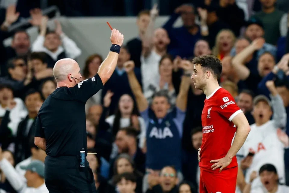 Liverpool bertambah parah apabila terpaksa beraksi dengan sembilan pemain selepas Diego Jota dibuang padang oleh pengadil Simon Hooper pada minit ke-69. – Foto premierleague.com