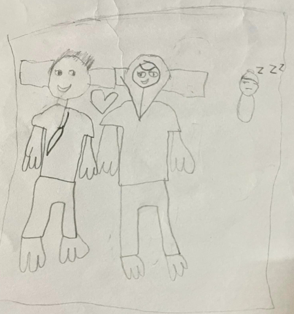 Mama mama, tengok ni Aydan lukis. Aydan lukis mama ayah dengan Aydan. Ni Aydan tengah tidur.