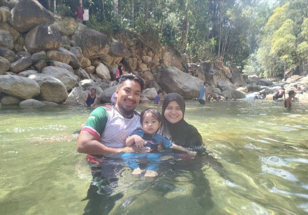Abdul Muizz (kiri) bersama isteri dan anaknya ketika berkunjung di Lata Kolam Air Deru Ecopark, di sini.