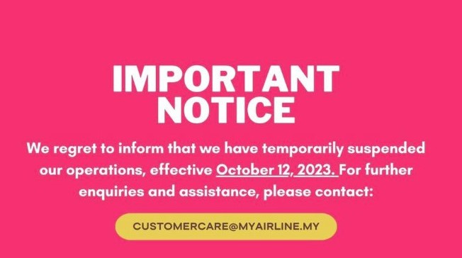 Menurut kenyataan media awal pagi ini, Lembaga Pengarah MYAirline berkata, syarikat penerbangan tambang rendah itu terpaksa menggantung operasi berikutan berlaku tekanan kewangan yang ketara.