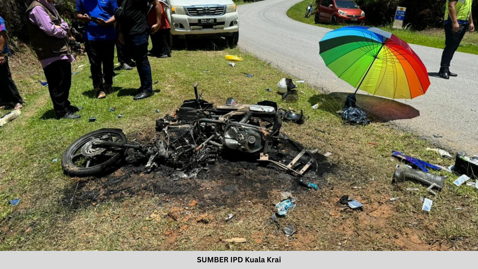 “Akibat perlanggaran itu, motosikal tersebut telah terbakar dan penunggangnya mengalami kecederaan parah di kepala seterusnya disahkan meninggal dunia di tempat kejadian dan mayatnya telah dibawa ke Bahagian Forensik Hospital Sultan Ismail Petra untuk proses bedah siasat,” katanya dalam satu kenyataan.