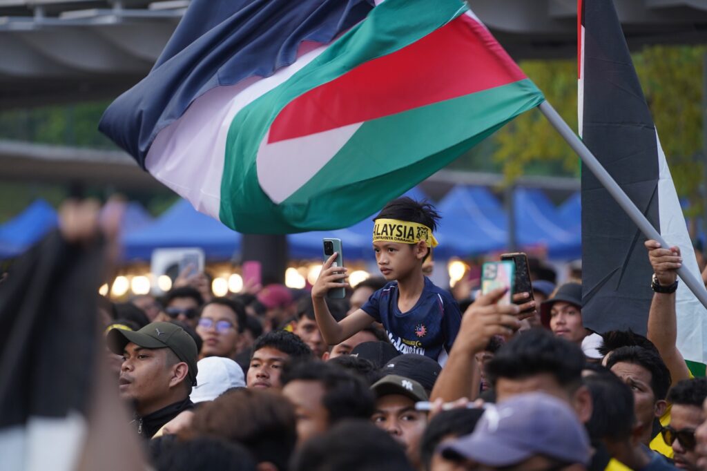 KUALA LUMPUR: Penyokong Harimau Malaya menzahirkan solidariti kepada rakyat Palestin yang kini berada dalam situasi peperangan di Semenanjung Gaza.