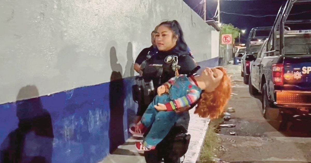 Seorang pegawai di jabatan polis di Monclova, di negeri Coahuila, dilihat ketawa sambil mengangkat pisau panjang yang diambil daripada Chucky.