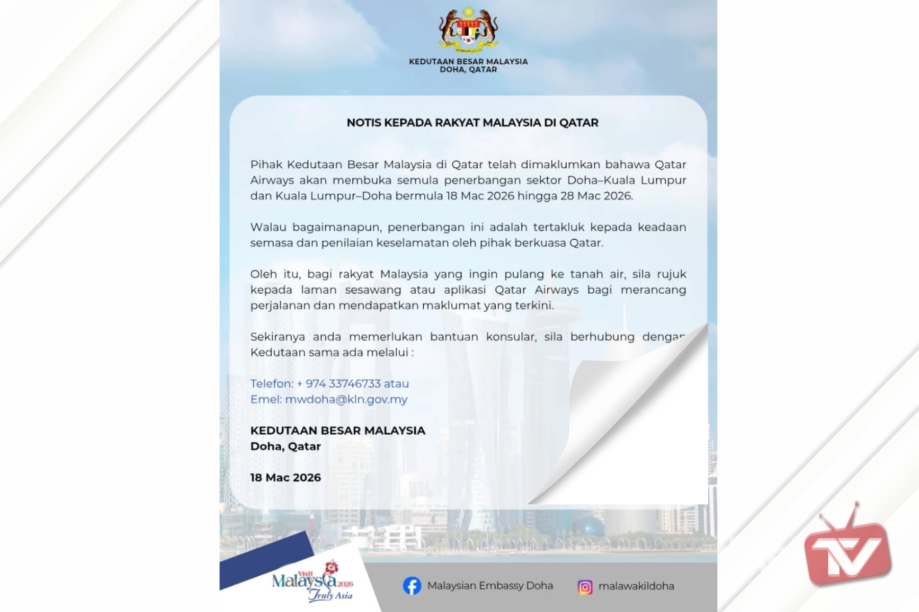 Dalam pada itu, sekiranya terdapat rakyat Malaysia memerlukan bantuan konsular boleh menghubungi pihak kedutaan melalui talian +974 33746733 atau emel mwdoha@kln.gov.my untuk sebarang pertanyaan atau bantuan lanjut,