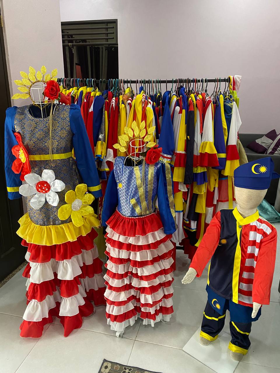 Pakaian Jalur Gemilang disewakan pada harga rm25 hingga rm35 mengikut saiz dan jenis.
