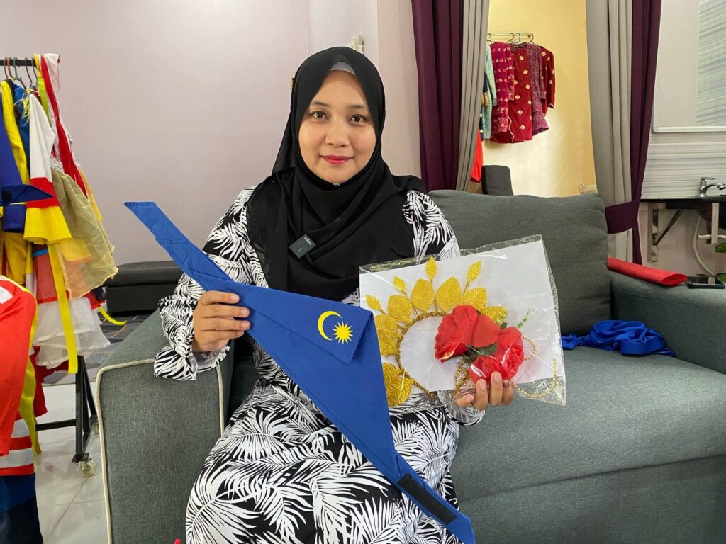 Mymy Suriana Zahari, 33, dari Kampung Pulau Kundur tempahan baju bercorak jalur gemilang daripada guru sekolah dan jiran tetangga untuk sambutan Bulan Kemerdekaan.