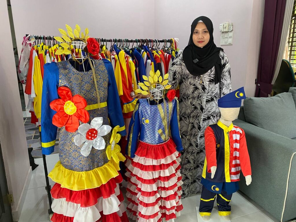 “Mula-mula tu jahit baju anak lepas tu ramai nak pinjam lepas tu nak sewa baju anak tu. Lepas tu tahun lepas tu lepas covid tu rasa nak buat sikit-sikit jela niat tu lepas tu masuk dalam Facebook ramai pula permintaan,”