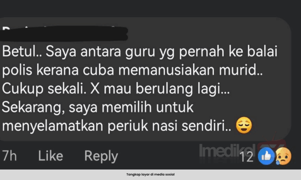 “Saya antara guru yang pernah ke balai polis kerana cuba memanusiakan murid. Cukup sekali, tidak mahu berulang lagi. Sekarang saya memilih untuk menyelamatkan periuk nasi saya,”tulisnya di media sosial.
