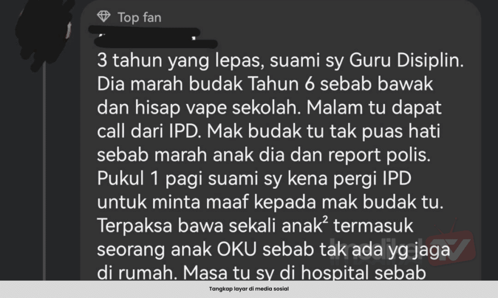 “Bagaimanapun pentadbir sekolah tidak mendengar sebelah pihak, tetapi sampai sekarang saya takut untuk mendenda murid,”katanya melalui tulisan komen di media sosial.
