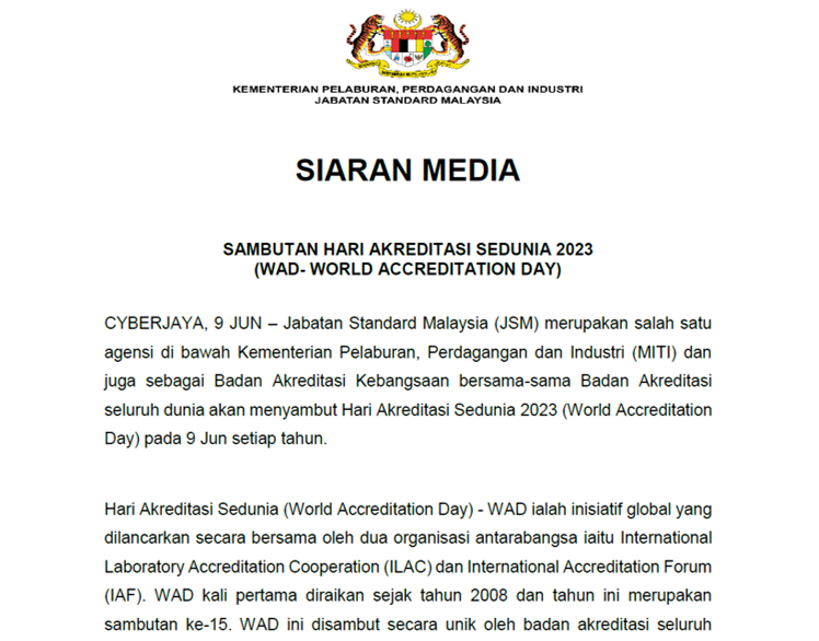 Jabatan Standard Malaysia (JSM) merupakan salah satu agensi di bawah Kementerian Pelaburan, Perdagangan dan Industri (MITI) dan juga sebagai Badan Akreditasi Kebangsaan bersama-sama Badan Akreditasi seluruh dunia akan menyambut Hari Akreditasi Sedunia 2023 (World Accreditation Day) pada 9 Jun setiap tahun.