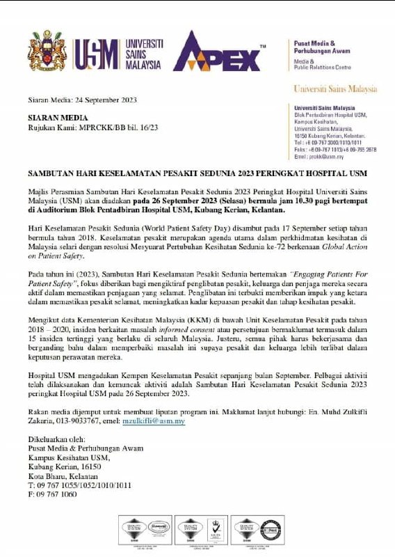 Hospital USM mengadakan kempen keselamatan pesakit sepanjang bulan September. Pelbagai aktiviti telah dilaksanakan dan kemuncak aktiviti adalah Sambutan Hari Keselamatan Pesakit Sedunia 2023 peringkat Hospital USM pada 26 September 2023.