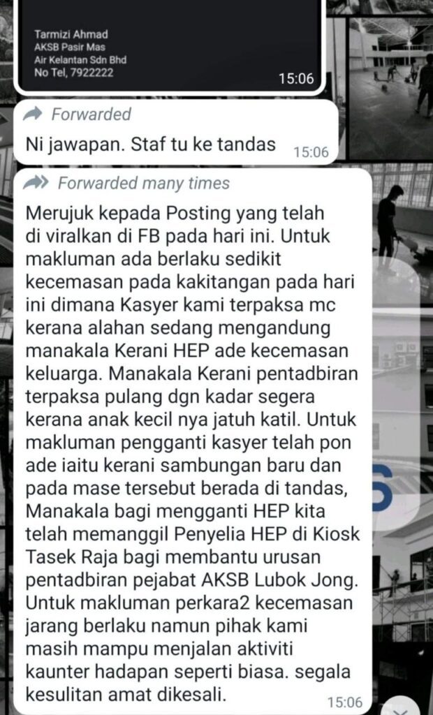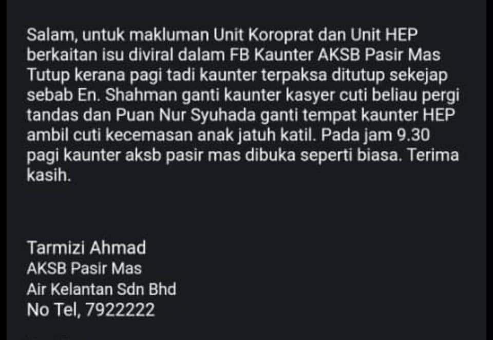 KOTA BHARU: Tular di media sosial di mana kaunter Air Kelantan Sdn Bhd (AKSB) jajahan Pasir Mas, kosong walaupun waktu pejabat sudah bermula.