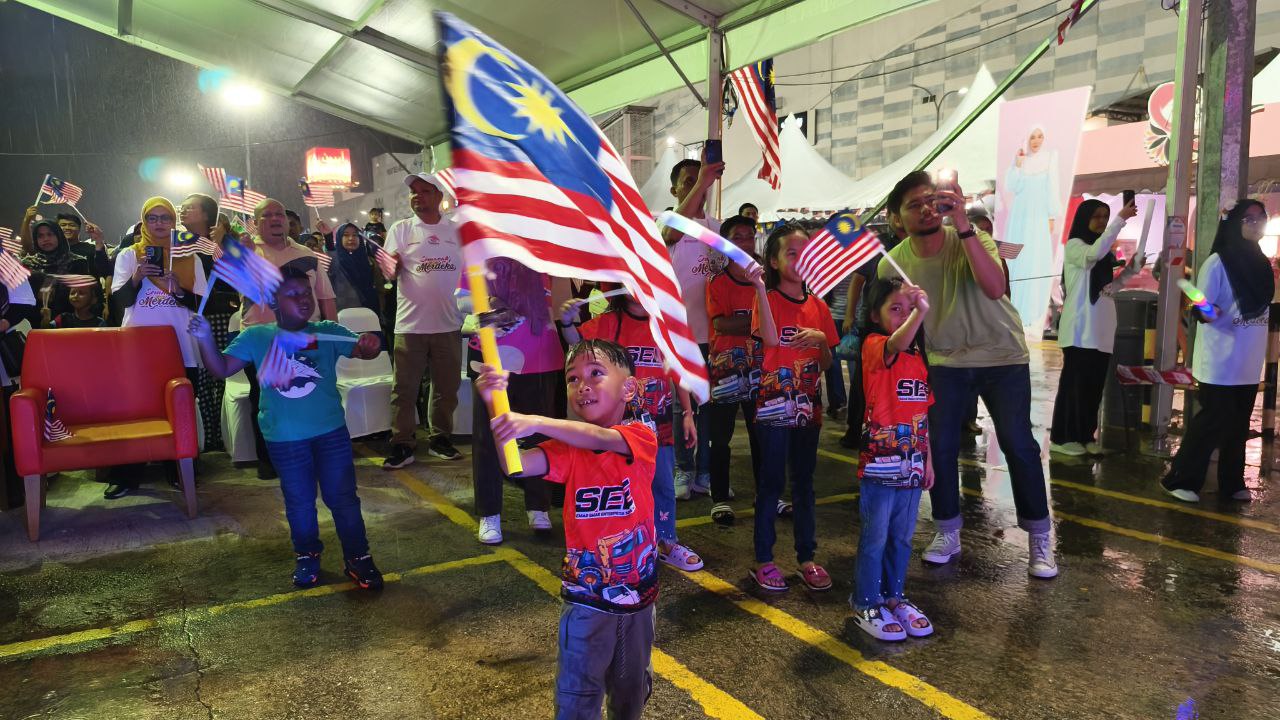 Muhammad Qais tampak bersemangat mengibarkan bendera di Program Semarak Jiwa Merdeka, di perkarangan parkir AEON Mall, malam tadi.