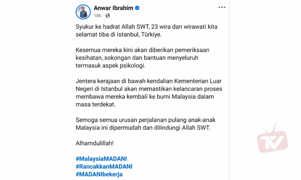 KUALA LUMPUR: Perdana Menteri Datuk Seri Anwar Ibrahim mengumumkan bahawa semua wira dan wirawati Malaysia yang menyertai misi kemanusiaan Global Sumud Flotilla sudah dibebaskan sepenuhnya dan selamat tiba di Istanbul malam tadi waktu Malaysia.