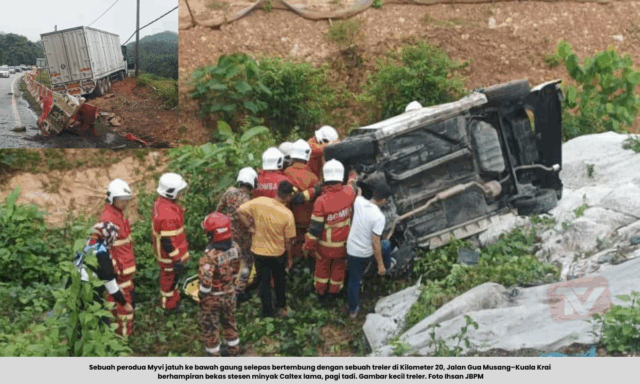 GUA MUSANG: Seorang wanita lingkungan 30-an tersepit selepas kereta Perodua Myvi yang dipandunya dipercayai bertembung dengan sebuah treler di Kilometer 20, Jalan Gua Musang–Kuala Krai berhampiran bekas stesen minyak Caltex lama, pagi tadi.