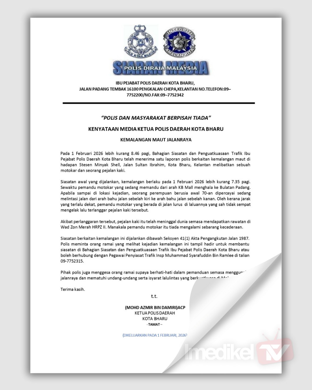 Sehubungan itu, polis meminta orang ramai yang menyaksikan kejadian tersebut supaya tampil membantu siasatan dengan hadir ke Bahagian Siasatan dan Penguatkuasaan Trafik IPD Kota Bharu atau menghubungi Pegawai Penyiasat Trafik, Inspektor Muhammad Syarafuddin Ramlee di talian 09-775 2315.